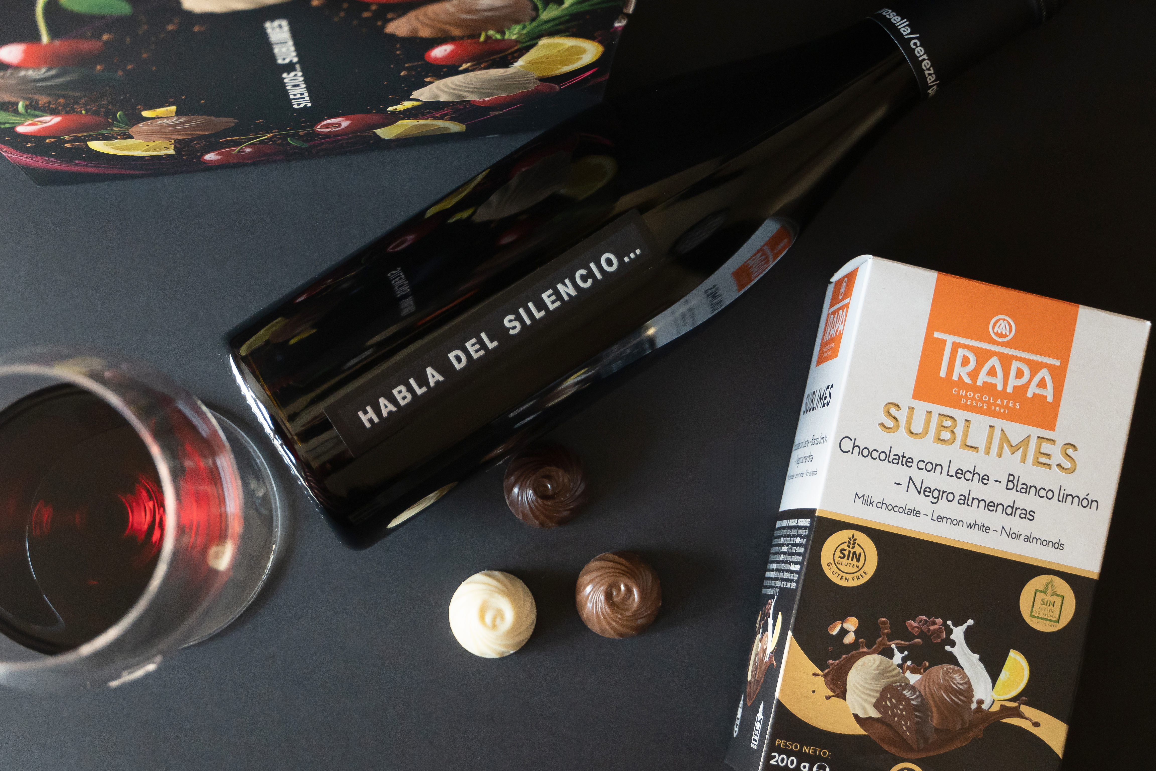 HABLA del Silencio… es un vino de color granate intenso, con matices violetas brillantes y limpios, que en nariz despliega un aroma complejo con toques de cereza madura, mora, menta, pimienta y grafito. En boca es goloso, fresco y carnoso a la vez, con notas frutales profundas y un inconfundible recuerdo a bombón de licor de cerezas. Las notas comunes entre este vino y los bombones Sublimes de Trapa —tostados, ahumados, frutos secos y cacao— crean una armonía natural y elegante. El vino abraza la untuosidad del chocolate y prolonga sus matices, mientras que la textura cremosa de los bombones suaviza y redondea los taninos, invitando a otro sorbo y otro bocado.
